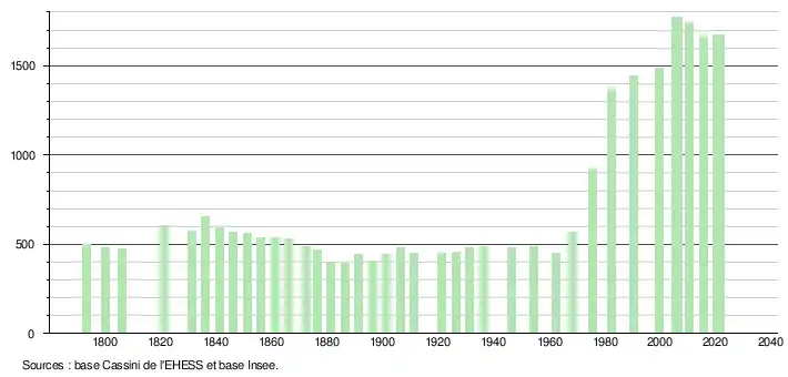 L'évolution du nombre d'habitants est connue à travers les recensements de la population effectués dans la commune depuis 1793. Pour les communes de moins de 10 000 habitants, une enquête de recensement portant sur toute la population est réalisée tous les cinq ans, les populations légales des années intermédiaires étant quant à elles estimées par interpolation ou extrapolation[26]. Pour la commune, le premier recensement exhaustif entrant dans le cadre du nouveau dispositif a été réalisé en 2005[27].