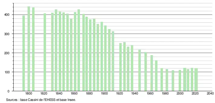 L'évolution du nombre d'habitants est connue à travers les recensements de la population effectués dans la commune depuis 1793. Pour les communes de moins de 10 000 habitants, une enquête de recensement portant sur toute la population est réalisée tous les cinq ans, les populations légales des années intermédiaires étant quant à elles estimées par interpolation ou extrapolation[15]. Pour la commune, le premier recensement exhaustif entrant dans le cadre du nouveau dispositif a été réalisé en 2005[16].
