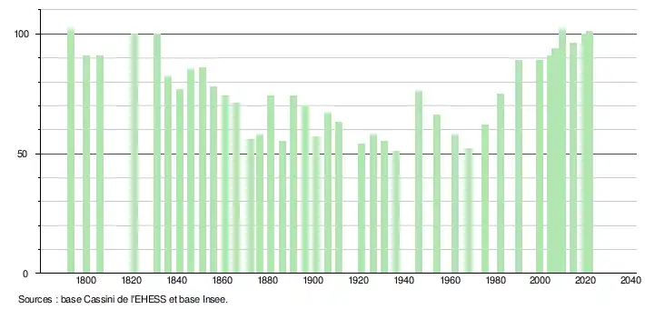 L'évolution du nombre d'habitants est connue à travers les recensements de la population effectués dans la commune depuis 1793. Pour les communes de moins de 10 000 habitants, une enquête de recensement portant sur toute la population est réalisée tous les cinq ans, les populations légales des années intermédiaires étant quant à elles estimées par interpolation ou extrapolation[19]. Pour la commune, le premier recensement exhaustif entrant dans le cadre du nouveau dispositif a été réalisé en 2004[20].