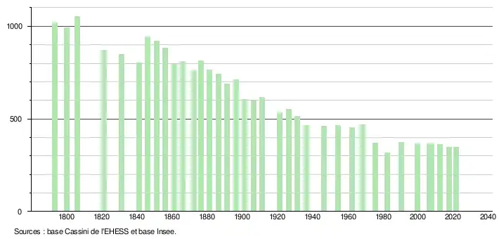 L'évolution du nombre d'habitants est connue à travers les recensements de la population effectués dans la commune depuis 1793. Pour les communes de moins de 10 000 habitants, une enquête de recensement portant sur toute la population est réalisée tous les cinq ans, les populations légales des années intermédiaires étant quant à elles estimées par interpolation ou extrapolation[39]. Pour la commune, le premier recensement exhaustif entrant dans le cadre du nouveau dispositif a été réalisé en 2007[40].