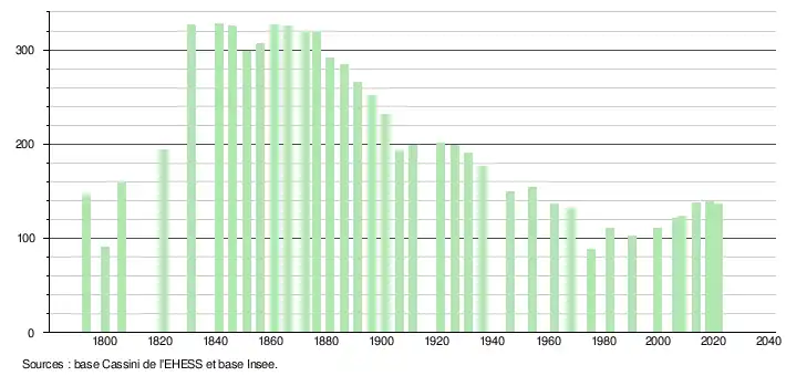 L'évolution du nombre d'habitants est connue à travers les recensements de la population effectués dans la commune depuis 1793. Pour les communes de moins de 10 000 habitants, une enquête de recensement portant sur toute la population est réalisée tous les cinq ans, les populations légales des années intermédiaires étant quant à elles estimées par interpolation ou extrapolation[23]. Pour la commune, le premier recensement exhaustif entrant dans le cadre du nouveau dispositif a été réalisé en 2008[24].