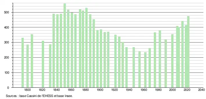 L'évolution du nombre d'habitants est connue à travers les recensements de la population effectués dans la commune depuis 1793. Pour les communes de moins de 10 000 habitants, une enquête de recensement portant sur toute la population est réalisée tous les cinq ans, les populations légales des années intermédiaires étant quant à elles estimées par interpolation ou extrapolation[22]. Pour la commune, le premier recensement exhaustif entrant dans le cadre du nouveau dispositif a été réalisé en 2008[23].