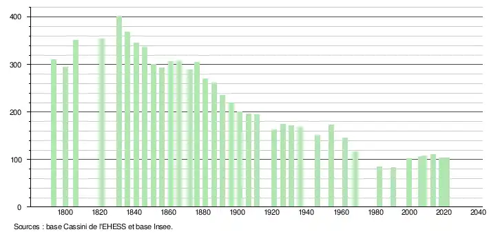 L'évolution du nombre d'habitants est connue à travers les recensements de la population effectués dans la commune depuis 1793. Pour les communes de moins de 10 000 habitants, une enquête de recensement portant sur toute la population est réalisée tous les cinq ans, les populations légales des années intermédiaires étant quant à elles estimées par interpolation ou extrapolation[21]. Pour la commune, le premier recensement exhaustif entrant dans le cadre du nouveau dispositif a été réalisé en 2008[22].