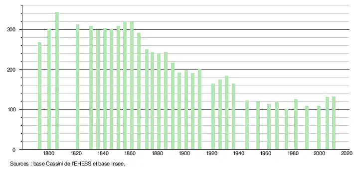 L'évolution du nombre d'habitants est connue à travers les recensements de la population effectués dans la commune depuis 1793. À partir du , les populations légales des communes sont publiées annuellement dans le cadre d'un recensement qui repose désormais sur une collecte d'information annuelle, concernant successivement tous les territoires communaux au cours d'une période de cinq ans. Pour les communes de moins de 10 000 habitants, une enquête de recensement portant sur toute la population est réalisée tous les cinq ans, les populations légales des années intermédiaires étant quant à elles estimées par interpolation ou extrapolation[3]. Pour la commune, le premier recensement exhaustif entrant dans le cadre du nouveau dispositif a été réalisé en 2005[4],[Note 1].
