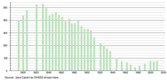 - Par convention dans Wikipédia, le principe a été retenu de n’afficher dans le tableau des recensements et le graphique, pour les populations légales postérieures à 1999, que les populations correspondant à une enquête exhaustive de recensement pour les communes de moins de 10 000 habitants, et que les populations des années 2006, 2011, 2016, etc. pour les communes de plus de 10 000 habitants, ainsi que la dernière population légale publiée par l’Insee pour l'ensemble des communes.