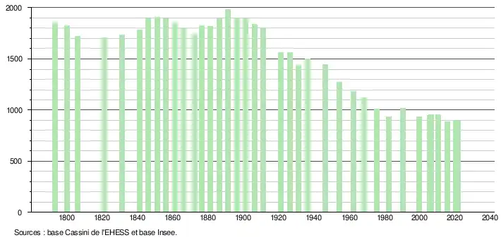 L'évolution du nombre d'habitants est connue à travers les recensements de la population effectués dans la commune depuis 1793. Pour les communes de moins de 10 000 habitants, une enquête de recensement portant sur toute la population est réalisée tous les cinq ans, les populations légales des années intermédiaires étant quant à elles estimées par interpolation ou extrapolation[36]. Pour la commune, le premier recensement exhaustif entrant dans le cadre du nouveau dispositif a été réalisé en 2005[37].