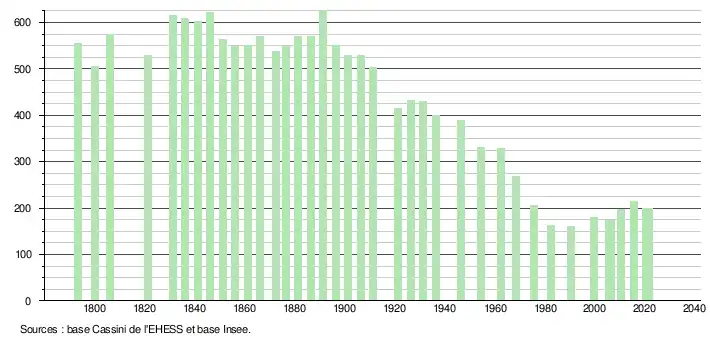 L'évolution du nombre d'habitants est connue à travers les recensements de la population effectués dans la commune depuis 1793. Pour les communes de moins de 10 000 habitants, une enquête de recensement portant sur toute la population est réalisée tous les cinq ans, les populations légales des années intermédiaires étant quant à elles estimées par interpolation ou extrapolation[17]. Pour la commune, le premier recensement exhaustif entrant dans le cadre du nouveau dispositif a été réalisé en 2005[18].