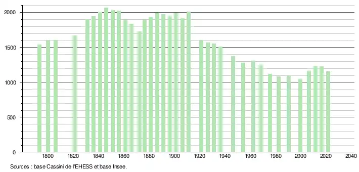 L'évolution du nombre d'habitants est connue à travers les recensements de la population effectués dans la commune depuis 1793. Pour les communes de moins de 10 000 habitants, une enquête de recensement portant sur toute la population est réalisée tous les cinq ans, les populations légales des années intermédiaires étant quant à elles estimées par interpolation ou extrapolation[34]. Pour la commune, le premier recensement exhaustif entrant dans le cadre du nouveau dispositif a été réalisé en 2006[35].