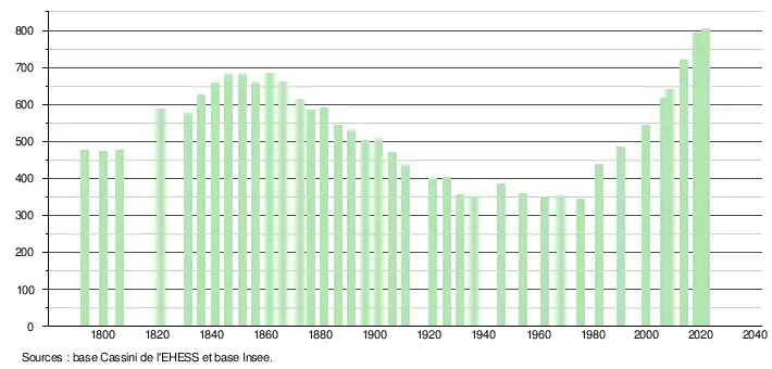 L'évolution du nombre d'habitants est connue à travers les recensements de la population effectués dans la commune depuis 1793. Pour les communes de moins de 10 000 habitants, une enquête de recensement portant sur toute la population est réalisée tous les cinq ans, les populations légales des années intermédiaires étant quant à elles estimées par interpolation ou extrapolation[17]. Pour la commune, le premier recensement exhaustif entrant dans le cadre du nouveau dispositif a été réalisé en 2008[18].