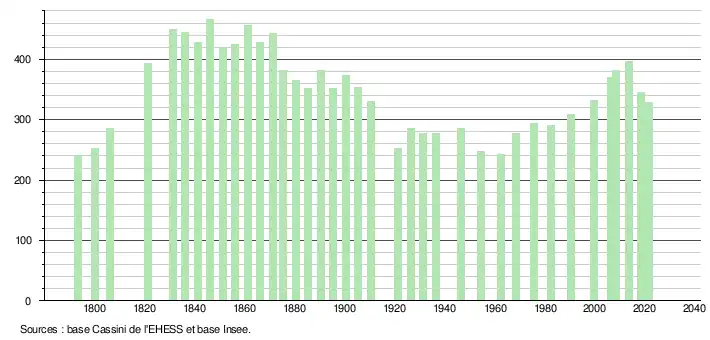 L'évolution du nombre d'habitants est connue à travers les recensements de la population effectués dans la commune depuis 1793. Pour les communes de moins de 10 000 habitants, une enquête de recensement portant sur toute la population est réalisée tous les cinq ans, les populations légales des années intermédiaires étant quant à elles estimées par interpolation ou extrapolation[17]. Pour la commune, le premier recensement exhaustif entrant dans le cadre du nouveau dispositif a été réalisé en 2008[18].