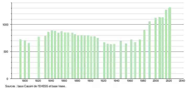 L'évolution du nombre d'habitants est connue à travers les recensements de la population effectués dans la commune depuis 1793. Pour les communes de moins de 10 000 habitants, une enquête de recensement portant sur toute la population est réalisée tous les cinq ans, les populations légales des années intermédiaires étant quant à elles estimées par interpolation ou extrapolation[26]. Pour la commune, le premier recensement exhaustif entrant dans le cadre du nouveau dispositif a été réalisé en 2005[27].