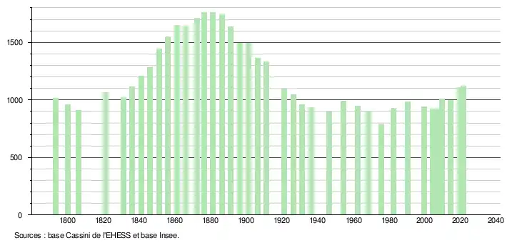 L'évolution du nombre d'habitants est connue à travers les recensements de la population effectués dans la commune depuis 1793. Pour les communes de moins de 10 000 habitants, une enquête de recensement portant sur toute la population est réalisée tous les cinq ans, les populations légales des années intermédiaires étant quant à elles estimées par interpolation ou extrapolation[24]. Pour la commune, le premier recensement exhaustif entrant dans le cadre du nouveau dispositif a été réalisé en 2004[25].