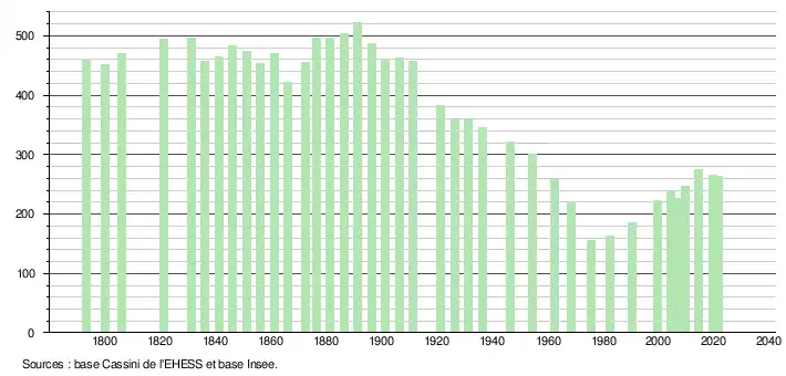 L'évolution du nombre d'habitants est connue à travers les recensements de la population effectués dans la commune depuis 1793. Pour les communes de moins de 10 000 habitants, une enquête de recensement portant sur toute la population est réalisée tous les cinq ans, les populations légales des années intermédiaires étant quant à elles estimées par interpolation ou extrapolation[17]. Pour la commune, le premier recensement exhaustif entrant dans le cadre du nouveau dispositif a été réalisé en 2004[18].