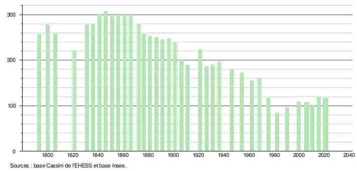 L'évolution du nombre d'habitants est connue à travers les recensements de la population effectués dans la commune depuis 1793. Pour les communes de moins de 10 000 habitants, une enquête de recensement portant sur toute la population est réalisée tous les cinq ans, les populations légales des années intermédiaires étant quant à elles estimées par interpolation ou extrapolation[18]. Pour la commune, le premier recensement exhaustif entrant dans le cadre du nouveau dispositif a été réalisé en 2005[19].