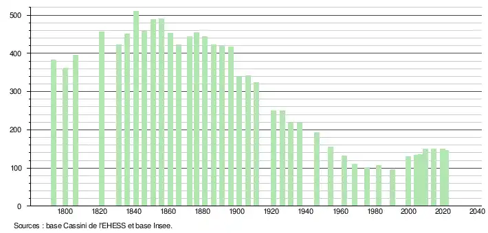 L'évolution du nombre d'habitants est connue à travers les recensements de la population effectués dans la commune depuis 1793. Pour les communes de moins de 10 000 habitants, une enquête de recensement portant sur toute la population est réalisée tous les cinq ans, les populations légales des années intermédiaires étant quant à elles estimées par interpolation ou extrapolation[21]. Pour la commune, le premier recensement exhaustif entrant dans le cadre du nouveau dispositif a été réalisé en 2004[22].