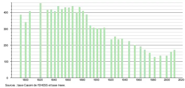 - Dans le tableau des recensements et le graphique, par convention dans Wikipédia, le principe a été retenu, pour les populations légales postérieures à 1999 de n’afficher dans le tableau des recensements et le graphique que les populations correspondant à l'année 2006, première population légale publiée calculée conformément aux concepts définis dans le décret no 2003-485 du 5 juin 2003, et les années correspondant à une enquête exhaustive de recensement pour les communes de moins de 10 000 habitants, ainsi que la dernière population légale publiée par l’Insee.