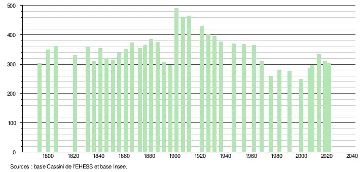 L'évolution du nombre d'habitants est connue à travers les recensements de la population effectués dans la commune depuis 1793. Pour les communes de moins de 10 000 habitants, une enquête de recensement portant sur toute la population est réalisée tous les cinq ans, les populations légales des années intermédiaires étant quant à elles estimées par interpolation ou extrapolation[19]. Pour la commune, le premier recensement exhaustif entrant dans le cadre du nouveau dispositif a été réalisé en 2008[20].