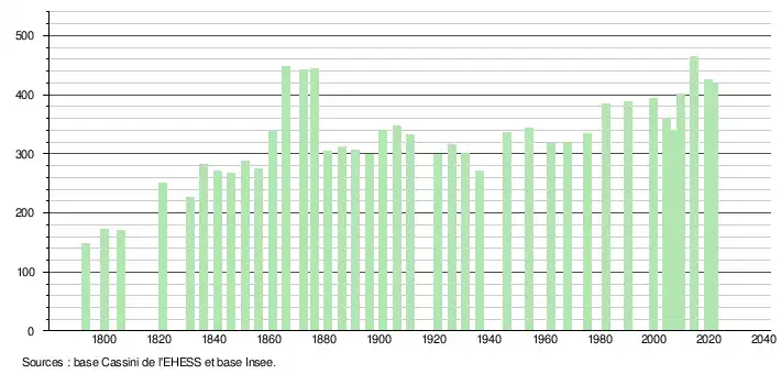 L'évolution du nombre d'habitants est connue à travers les recensements de la population effectués dans la commune depuis 1793. Pour les communes de moins de 10 000 habitants, une enquête de recensement portant sur toute la population est réalisée tous les cinq ans, les populations légales des années intermédiaires étant quant à elles estimées par interpolation ou extrapolation[24]. Pour la commune, le premier recensement exhaustif entrant dans le cadre du nouveau dispositif a été réalisé en 2004[25].