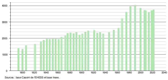 L'évolution du nombre d'habitants est connue à travers les recensements de la population effectués dans la commune depuis 1793. Pour les communes de moins de 10 000 habitants, une enquête de recensement portant sur toute la population est réalisée tous les cinq ans, les populations légales des années intermédiaires étant quant à elles estimées par interpolation ou extrapolation[27]. Pour la commune, le premier recensement exhaustif entrant dans le cadre du nouveau dispositif a été réalisé en 2008[28].