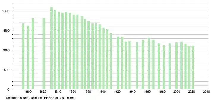 L'évolution du nombre d'habitants est connue à travers les recensements de la population effectués dans la commune depuis 1793. Pour les communes de moins de 10 000 habitants, une enquête de recensement portant sur toute la population est réalisée tous les cinq ans, les populations légales des années intermédiaires étant quant à elles estimées par interpolation ou extrapolation[31]. Pour la commune, le premier recensement exhaustif entrant dans le cadre du nouveau dispositif a été réalisé en 2006[32].