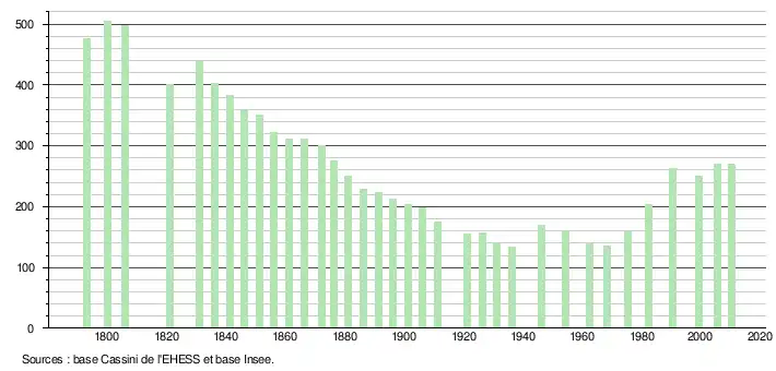 L'évolution du nombre d'habitants est connue à travers les recensements de la population effectués dans la commune depuis 1793. À partir du , les populations légales des communes sont publiées annuellement dans le cadre d'un recensement qui repose désormais sur une collecte d'information annuelle, concernant successivement tous les territoires communaux au cours d'une période de cinq ans. Pour les communes de moins de 10 000 habitants, une enquête de recensement portant sur toute la population est réalisée tous les cinq ans, les populations légales des années intermédiaires étant quant à elles estimées par interpolation ou extrapolation[3]. Pour la commune, le premier recensement exhaustif entrant dans le cadre du nouveau dispositif a été réalisé en 2005[4],[Note 1].