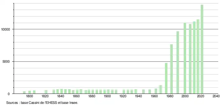 - Par convention dans Wikipédia, le principe a été retenu de n’afficher dans le tableau des recensements et le graphique, pour les populations légales postérieures à 1999, que les populations correspondant à une enquête exhaustive de recensement pour les communes de moins de 10 000 habitants, et que les populations des années 2006, 2011, 2016, etc. pour les communes de plus de 10 000 habitants, ainsi que la dernière population légale publiée par l’Insee pour l'ensemble des communes.
