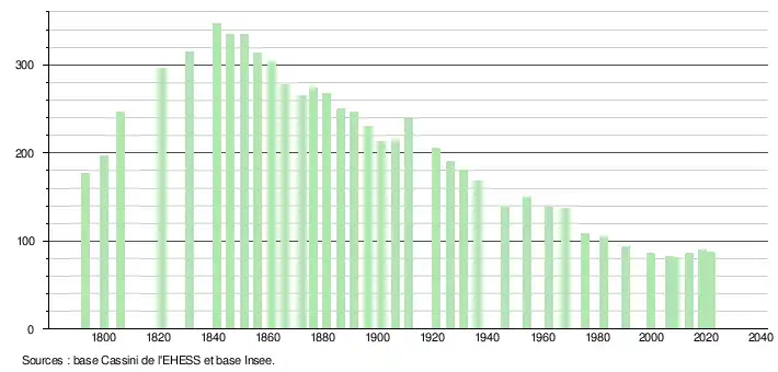 | L'évolution du nombre d'habitants est connue à travers les recensements de la population effectués dans la commune depuis 1793. Pour les communes de moins de 10 000 habitants, une enquête de recensement portant sur toute la population est réalisée tous les cinq ans, les populations légales des années intermédiaires étant quant à elles estimées par interpolation ou extrapolation[26]. Pour la commune, le premier recensement exhaustif entrant dans le cadre du nouveau dispositif a été réalisé en 2008[27]. En 2021, la commune comptait 88 habitants[Note 4], en augmentation de 10 % par rapport à 2015 (Gers : +0,79 %, France hors Mayotte : +1,84 %). |