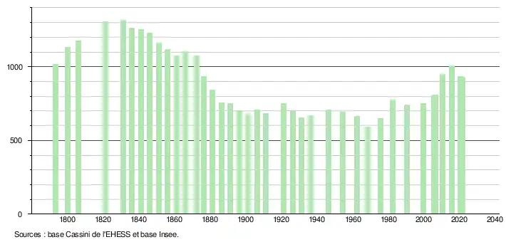 L'évolution du nombre d'habitants est connue à travers les recensements de la population effectués dans la commune depuis 1793. Pour les communes de moins de 10 000 habitants, une enquête de recensement portant sur toute la population est réalisée tous les cinq ans, les populations légales des années intermédiaires étant quant à elles estimées par interpolation ou extrapolation[16]. Pour la commune, le premier recensement exhaustif entrant dans le cadre du nouveau dispositif a été réalisé en 2005[17].