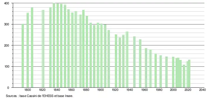 L'évolution du nombre d'habitants est connue à travers les recensements de la population effectués dans la commune depuis 1793. Pour les communes de moins de 10 000 habitants, une enquête de recensement portant sur toute la population est réalisée tous les cinq ans, les populations légales des années intermédiaires étant quant à elles estimées par interpolation ou extrapolation[18]. Pour la commune, le premier recensement exhaustif entrant dans le cadre du nouveau dispositif a été réalisé en 2004[19].