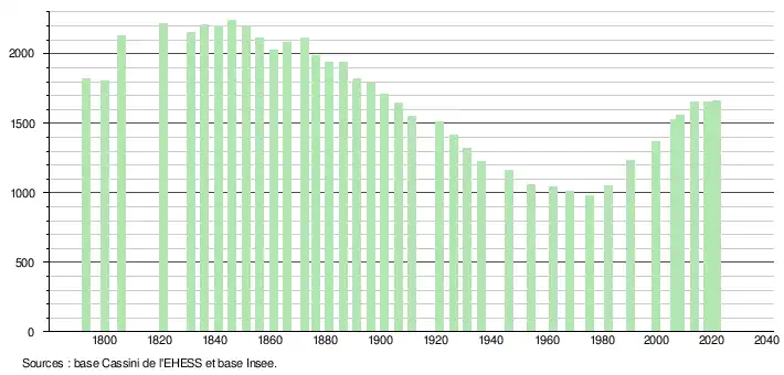 L'évolution du nombre d'habitants est connue à travers les recensements de la population effectués dans la commune depuis 1793. Pour les communes de moins de 10 000 habitants, une enquête de recensement portant sur toute la population est réalisée tous les cinq ans, les populations légales des années intermédiaires étant quant à elles estimées par interpolation ou extrapolation[30]. Pour la commune, le premier recensement exhaustif entrant dans le cadre du nouveau dispositif a été réalisé en 2008[31].