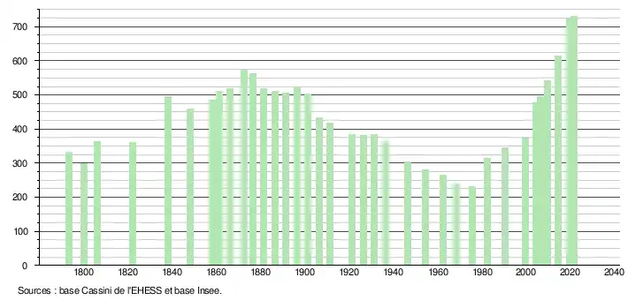 L'évolution du nombre d'habitants est connue à travers les recensements de la population effectués dans la commune depuis 1793. Pour les communes de moins de 10 000 habitants, une enquête de recensement portant sur toute la population est réalisée tous les cinq ans, les populations légales des années intermédiaires étant quant à elles estimées par interpolation ou extrapolation[9]. Pour la commune, le premier recensement exhaustif entrant dans le cadre du nouveau dispositif a été réalisé en 2004[10].