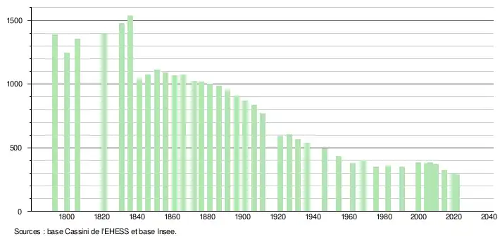 L'évolution du nombre d'habitants est connue à travers les recensements de la population effectués dans la commune depuis 1793. Pour les communes de moins de 10 000 habitants, une enquête de recensement portant sur toute la population est réalisée tous les cinq ans, les populations légales des années intermédiaires étant quant à elles estimées par interpolation ou extrapolation[32]. Pour la commune, le premier recensement exhaustif entrant dans le cadre du nouveau dispositif a été réalisé en 2004[33].