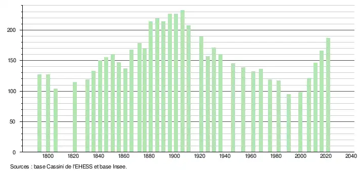 L'évolution du nombre d'habitants est connue à travers les recensements de la population effectués dans la commune depuis 1793. Pour les communes de moins de 10 000 habitants, une enquête de recensement portant sur toute la population est réalisée tous les cinq ans, les populations légales des années intermédiaires étant quant à elles estimées par interpolation ou extrapolation[14]. Pour la commune, le premier recensement exhaustif entrant dans le cadre du nouveau dispositif a été réalisé en 2006[15].