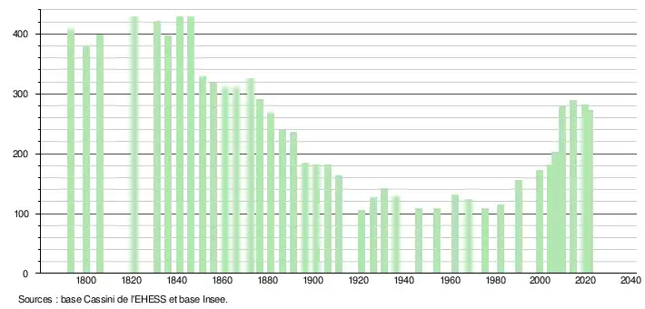 L'évolution du nombre d'habitants est connue à travers les recensements de la population effectués dans la commune depuis 1793. Pour les communes de moins de 10 000 habitants, une enquête de recensement portant sur toute la population est réalisée tous les cinq ans, les populations légales des années intermédiaires étant quant à elles estimées par interpolation ou extrapolation[18]. Pour la commune, le premier recensement exhaustif entrant dans le cadre du nouveau dispositif a été réalisé en 2004[19].