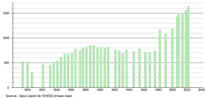 L'évolution du nombre d'habitants est connue à travers les recensements de la population effectués dans la commune depuis 1793. Pour les communes de moins de 10 000 habitants, une enquête de recensement portant sur toute la population est réalisée tous les cinq ans, les populations légales des années intermédiaires étant quant à elles estimées par interpolation ou extrapolation[19]. Pour la commune, le premier recensement exhaustif entrant dans le cadre du nouveau dispositif a été réalisé en 2008[20].