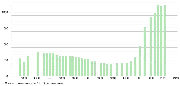 L'évolution du nombre d'habitants est connue à travers les recensements de la population effectués dans la commune depuis 1793. Pour les communes de moins de 10 000 habitants, une enquête de recensement portant sur toute la population est réalisée tous les cinq ans, les populations légales des années intermédiaires étant quant à elles estimées par interpolation ou extrapolation[25]. Pour la commune, le premier recensement exhaustif entrant dans le cadre du nouveau dispositif a été réalisé en 2006[26].