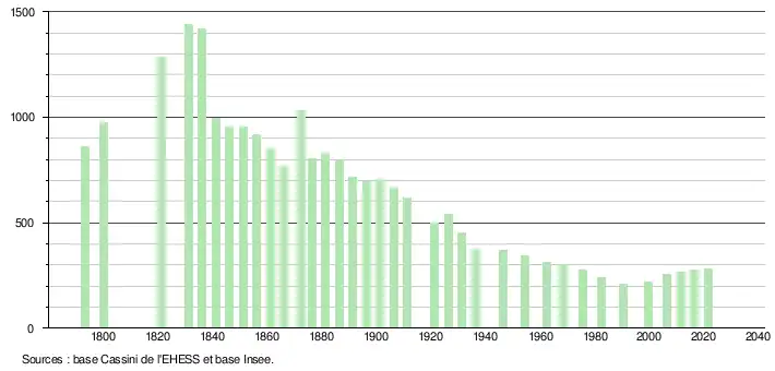 L'évolution du nombre d'habitants est connue à travers les recensements de la population effectués dans la commune depuis 1793. Pour les communes de moins de 10 000 habitants, une enquête de recensement portant sur toute la population est réalisée tous les cinq ans, les populations légales des années intermédiaires étant quant à elles estimées par interpolation ou extrapolation[10]. Pour la commune, le premier recensement exhaustif entrant dans le cadre du nouveau dispositif a été réalisé en 2006[11].