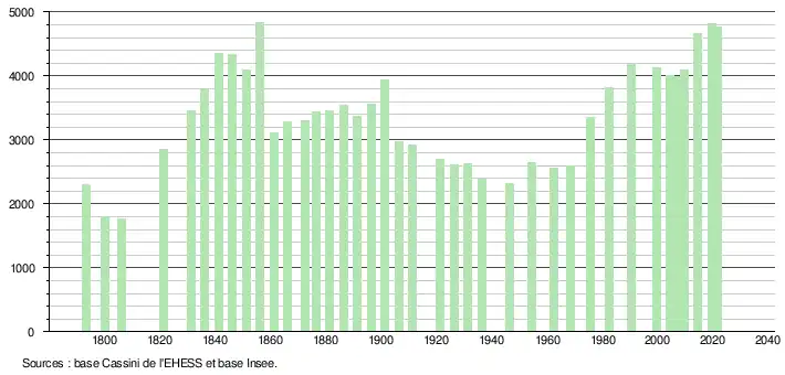 L'évolution du nombre d'habitants est connue à travers les recensements de la population effectués dans la commune depuis 1793. Pour les communes de moins de 10 000 habitants, une enquête de recensement portant sur toute la population est réalisée tous les cinq ans, les populations légales des années intermédiaires étant quant à elles estimées par interpolation ou extrapolation[25]. Pour la commune, le premier recensement exhaustif entrant dans le cadre du nouveau dispositif a été réalisé en 2004[26].