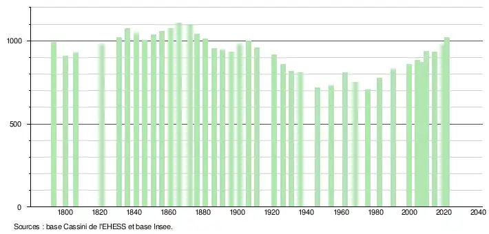 L'évolution du nombre d'habitants est connue à travers les recensements de la population effectués dans la commune depuis 1793. Pour les communes de moins de 10 000 habitants, une enquête de recensement portant sur toute la population est réalisée tous les cinq ans, les populations légales des années intermédiaires étant quant à elles estimées par interpolation ou extrapolation[25]. Pour la commune, le premier recensement exhaustif entrant dans le cadre du nouveau dispositif a été réalisé en 2004[26].