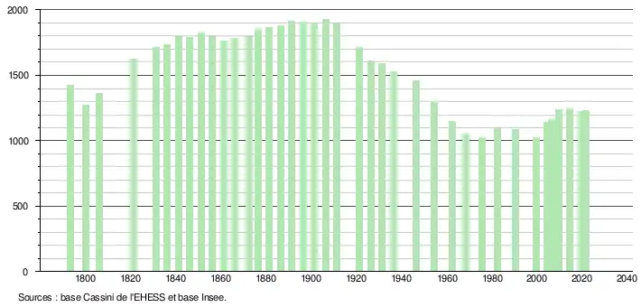 L'évolution du nombre d'habitants est connue à travers les recensements de la population effectués dans la commune depuis 1793. Pour les communes de moins de 10 000 habitants, une enquête de recensement portant sur toute la population est réalisée tous les cinq ans, les populations légales des années intermédiaires étant quant à elles estimées par interpolation ou extrapolation[22]. Pour la commune, le premier recensement exhaustif entrant dans le cadre du nouveau dispositif a été réalisé en 2004[23].