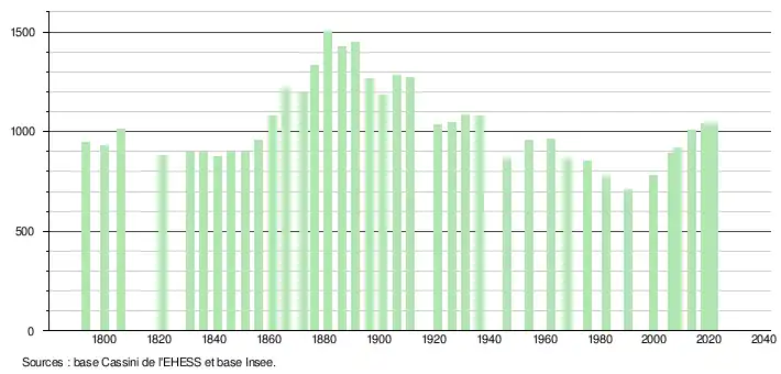L'évolution du nombre d'habitants est connue à travers les recensements de la population effectués dans la commune depuis 1793. Pour les communes de moins de 10 000 habitants, une enquête de recensement portant sur toute la population est réalisée tous les cinq ans, les populations légales des années intermédiaires étant quant à elles estimées par interpolation ou extrapolation[19]. Pour la commune, le premier recensement exhaustif entrant dans le cadre du nouveau dispositif a été réalisé en 2008[20].