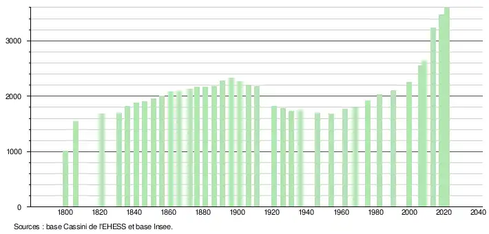 L'évolution du nombre d'habitants est connue à travers les recensements de la population effectués dans la commune depuis 1800. Pour les communes de moins de 10 000 habitants, une enquête de recensement portant sur toute la population est réalisée tous les cinq ans, les populations légales des années intermédiaires étant quant à elles estimées par interpolation ou extrapolation[23]. Pour la commune, le premier recensement exhaustif entrant dans le cadre du nouveau dispositif a été réalisé en 2008[24].