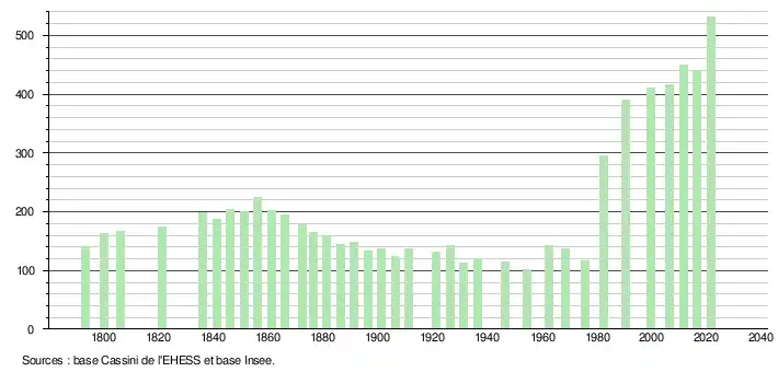 L'évolution du nombre d'habitants est connue à travers les recensements de la population effectués dans la commune depuis 1793. Pour les communes de moins de 10 000 habitants, une enquête de recensement portant sur toute la population est réalisée tous les cinq ans, les populations légales des années intermédiaires étant quant à elles estimées par interpolation ou extrapolation[14]. Pour la commune, le premier recensement exhaustif entrant dans le cadre du nouveau dispositif a été réalisé en 2006[15].