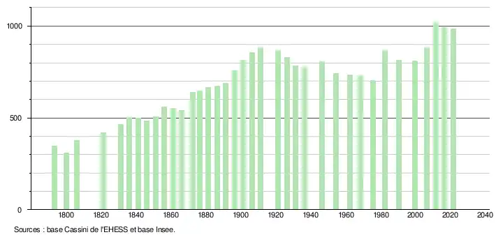 L'évolution du nombre d'habitants est connue à travers les recensements de la population effectués dans la commune depuis 1793. Pour les communes de moins de 10 000 habitants, une enquête de recensement portant sur toute la population est réalisée tous les cinq ans, les populations légales des années intermédiaires étant quant à elles estimées par interpolation ou extrapolation[53]. Pour la commune, le premier recensement exhaustif entrant dans le cadre du nouveau dispositif a été réalisé en 2006[54].