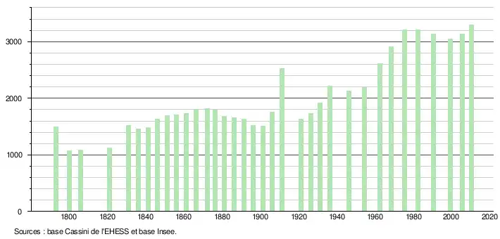 L'évolution du nombre d'habitants est connue à travers les recensements de la population effectués dans la commune depuis 1793. À partir du , les populations légales des communes sont publiées annuellement dans le cadre d'un recensement qui repose désormais sur une collecte d'information annuelle, concernant successivement tous les territoires communaux au cours d'une période de cinq ans. Pour les communes de moins de 10 000 habitants, une enquête de recensement portant sur toute la population est réalisée tous les cinq ans, les populations légales des années intermédiaires étant quant à elles estimées par interpolation ou extrapolation[14]. Pour la commune, le premier recensement exhaustif entrant dans le cadre du nouveau dispositif a été réalisé en 2005[15],[Note 1].