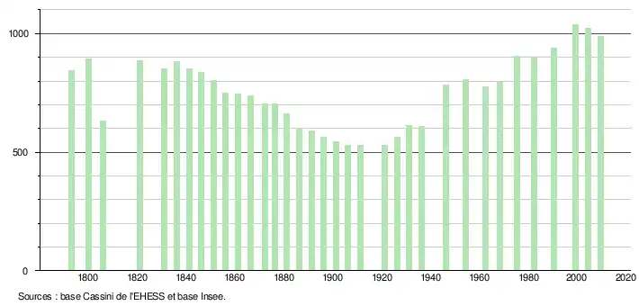 L'évolution du nombre d'habitants est connue à travers les recensements de la population effectués dans la commune depuis 1793. À partir du , les populations légales des communes sont publiées annuellement dans le cadre d'un recensement qui repose désormais sur une collecte d'information annuelle, concernant successivement tous les territoires communaux au cours d'une période de cinq ans. Pour les communes de moins de 10 000 habitants, une enquête de recensement portant sur toute la population est réalisée tous les cinq ans, les populations légales des années intermédiaires étant quant à elles estimées par interpolation ou extrapolation[14]. Pour la commune, le premier recensement exhaustif entrant dans le cadre du nouveau dispositif a été réalisé en 2004[15],[Note 1].