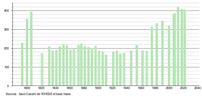L'évolution du nombre d'habitants est connue à travers les recensements de la population effectués dans la commune depuis 1793. Pour les communes de moins de 10 000 habitants, une enquête de recensement portant sur toute la population est réalisée tous les cinq ans, les populations légales des années intermédiaires étant quant à elles estimées par interpolation ou extrapolation[30]. Pour la commune, le premier recensement exhaustif entrant dans le cadre du nouveau dispositif a été réalisé en 2007[31].