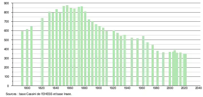 L'évolution du nombre d'habitants est connue à travers les recensements de la population effectués dans la commune depuis 1793. Pour les communes de moins de 10 000 habitants, une enquête de recensement portant sur toute la population est réalisée tous les cinq ans, les populations légales des années intermédiaires étant quant à elles estimées par interpolation ou extrapolation[16]. Pour la commune, le premier recensement exhaustif entrant dans le cadre du nouveau dispositif a été réalisé en 2004[17].