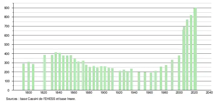 L'évolution du nombre d'habitants est connue à travers les recensements de la population effectués dans la commune depuis 1793. Pour les communes de moins de 10 000 habitants, une enquête de recensement portant sur toute la population est réalisée tous les cinq ans, les populations légales des années intermédiaires étant quant à elles estimées par interpolation ou extrapolation[29]. Pour la commune, le premier recensement exhaustif entrant dans le cadre du nouveau dispositif a été réalisé en 2005[30].