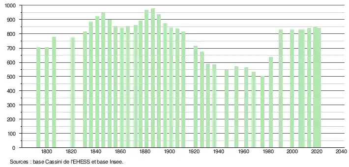 L'évolution du nombre d'habitants est connue à travers les recensements de la population effectués dans la commune depuis 1793. Pour les communes de moins de 10 000 habitants, une enquête de recensement portant sur toute la population est réalisée tous les cinq ans, les populations légales des années intermédiaires étant quant à elles estimées par interpolation ou extrapolation[14]. Pour la commune, le premier recensement exhaustif entrant dans le cadre du nouveau dispositif a été réalisé en 2008[15].